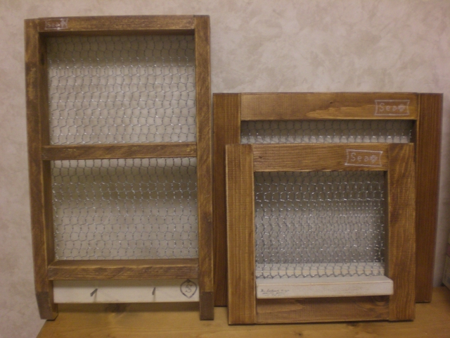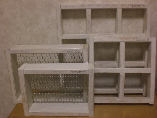 写真やイラスト小物などを飾るフレームの壁掛けと同じ用途で2段に分かれていて下の部分にアイアンネイルを打ち込んだ壁掛けと小物を飾るための飾り棚です。