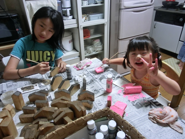 こちらは海花が「海花もピンクでぬる~!!」と言うのであまった木でペイントしました